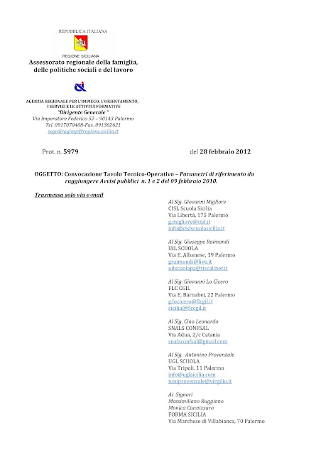 Convocazione Tavolo Tecnico-Operativo – Parametri di riferimento da raggiungere Avvisi pubblici n. 1 e 2 del 09 febbraio 2010.